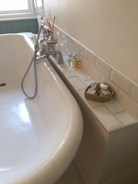 • We decided to build a shelf next to the bath, fitted onto the wall. This provided storage for the taps/pipes and meant we have somewhere to put our bubble bath, shampoo etc when having a bath.